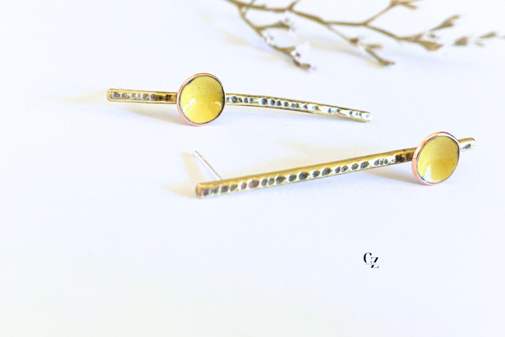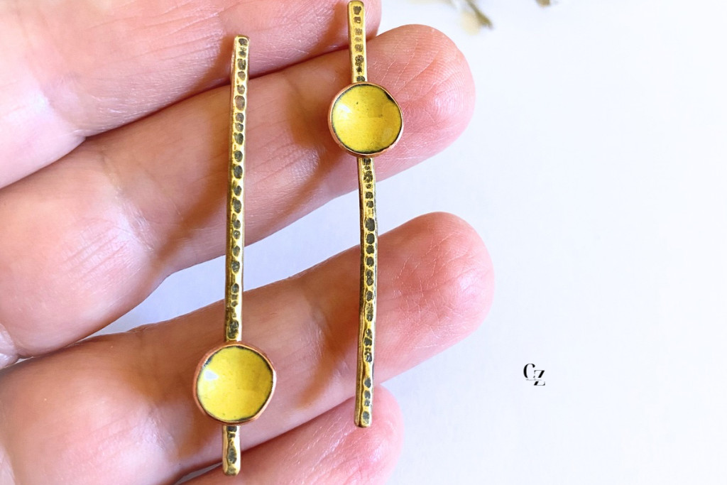 Elegáns, mégis játékos megjelenésű kézműves fülbevaló, amelyet a finom részletek tesznek igazán különlegessé. A hosszúkás, sárgaréz elem felülete kézzel kalapált, így minden darab egyedi textúrát kap. A fülbevalót egy apró, kör alakú tűzzománc betét díszíti, amely visszafogott színével szépen harmonizál a meleg arany tónusú fémmel. Az egyik kör elem lent, a másik fent kapott helyet, vagyis aszimmetrikus elrendezésű.