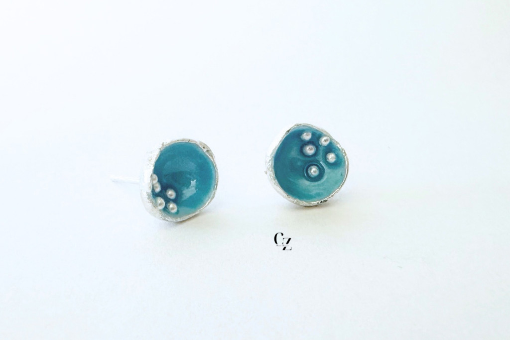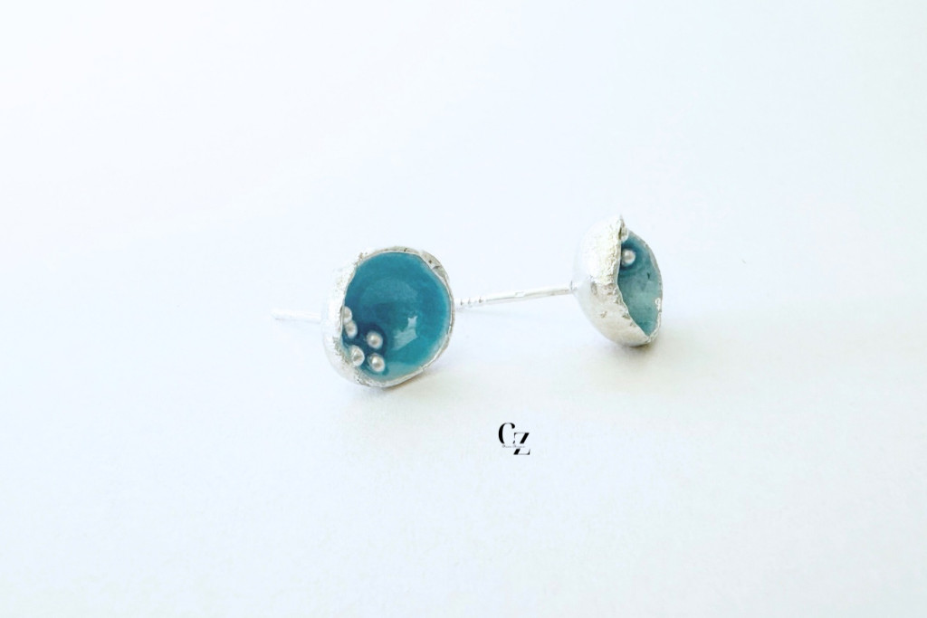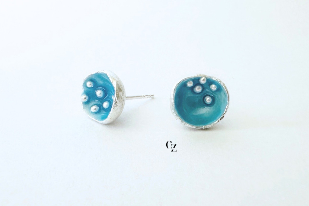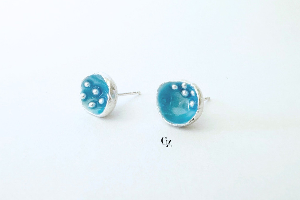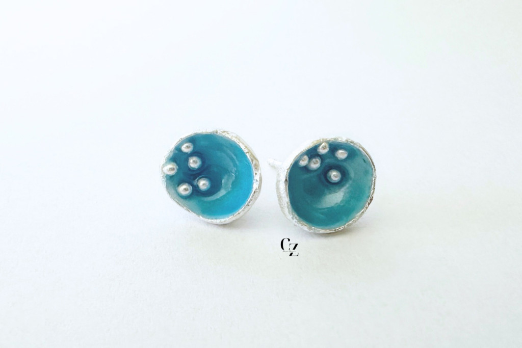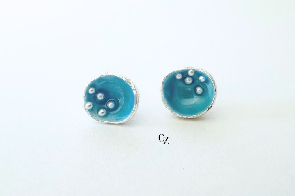 Kézzel készült ezüst fülbevaló, türkizkék tűzzománccal és apró ezüst buborékokkal.
