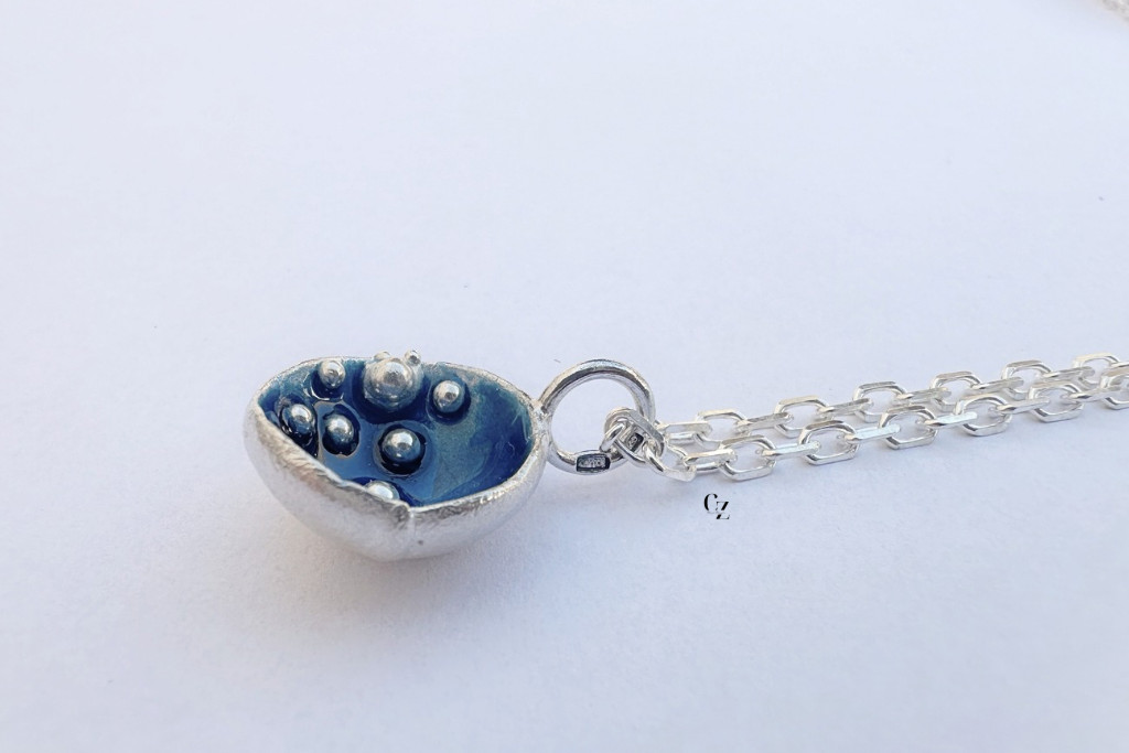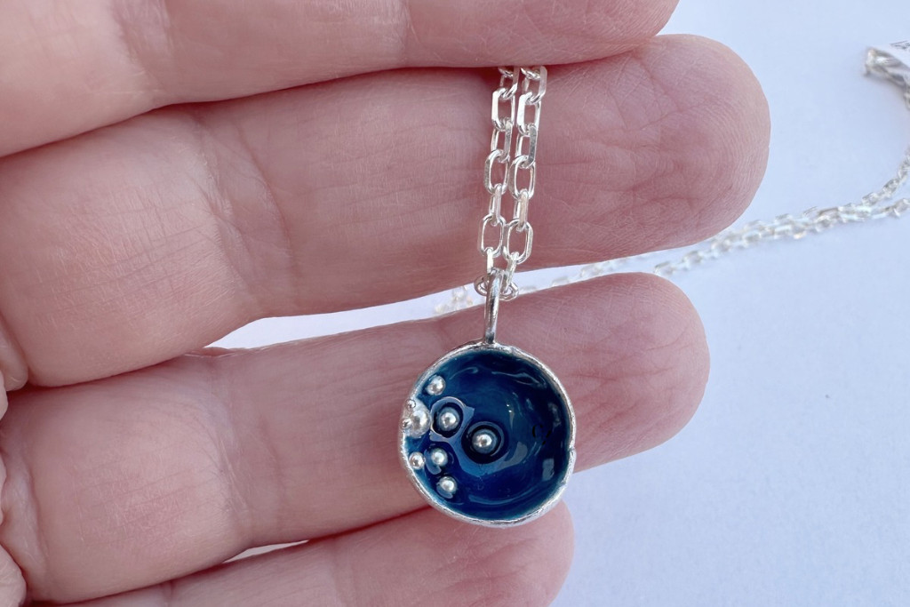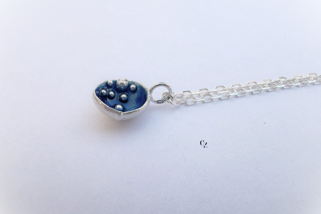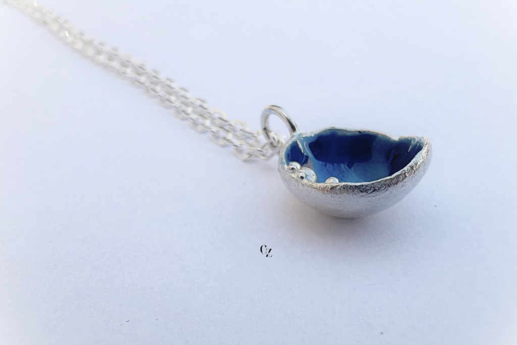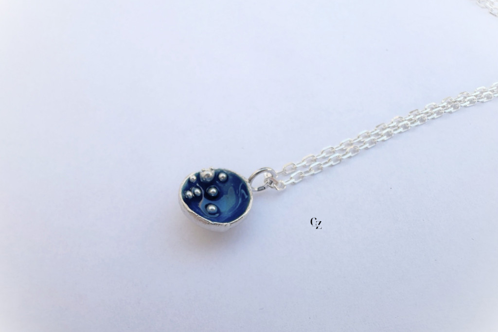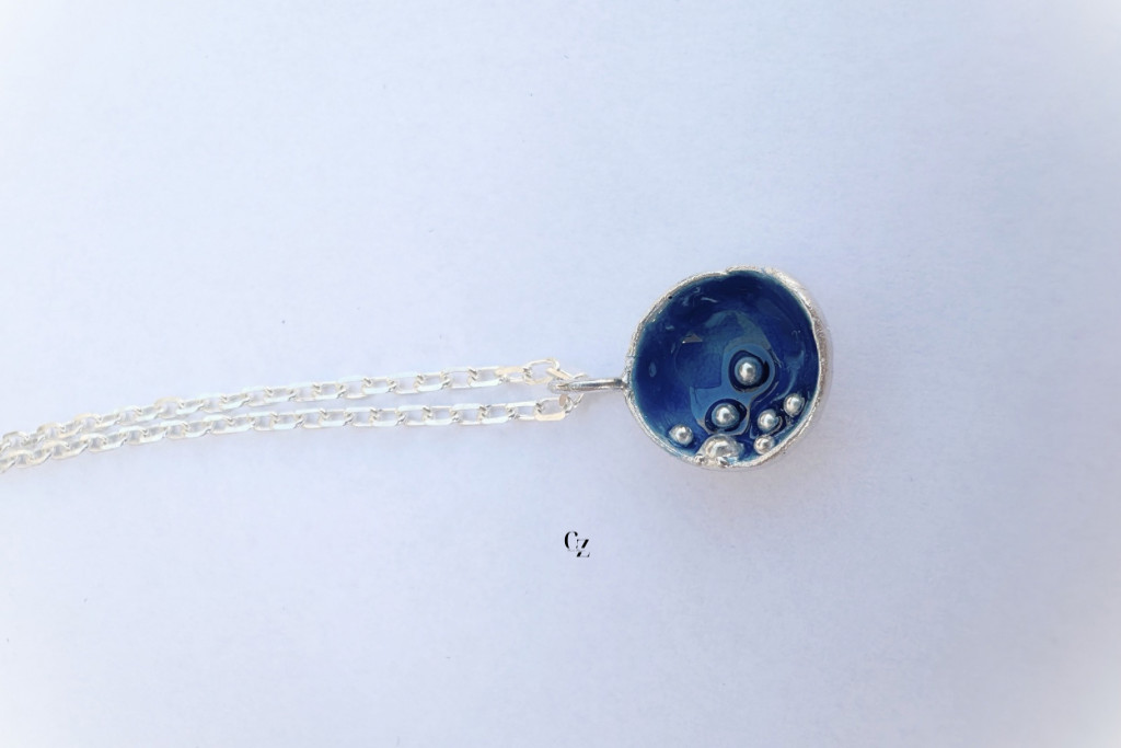 Kézzel készült ezüst medál ezüst lánccal, sötét kék tűzzománccal és apró ezüst buborékokkal.