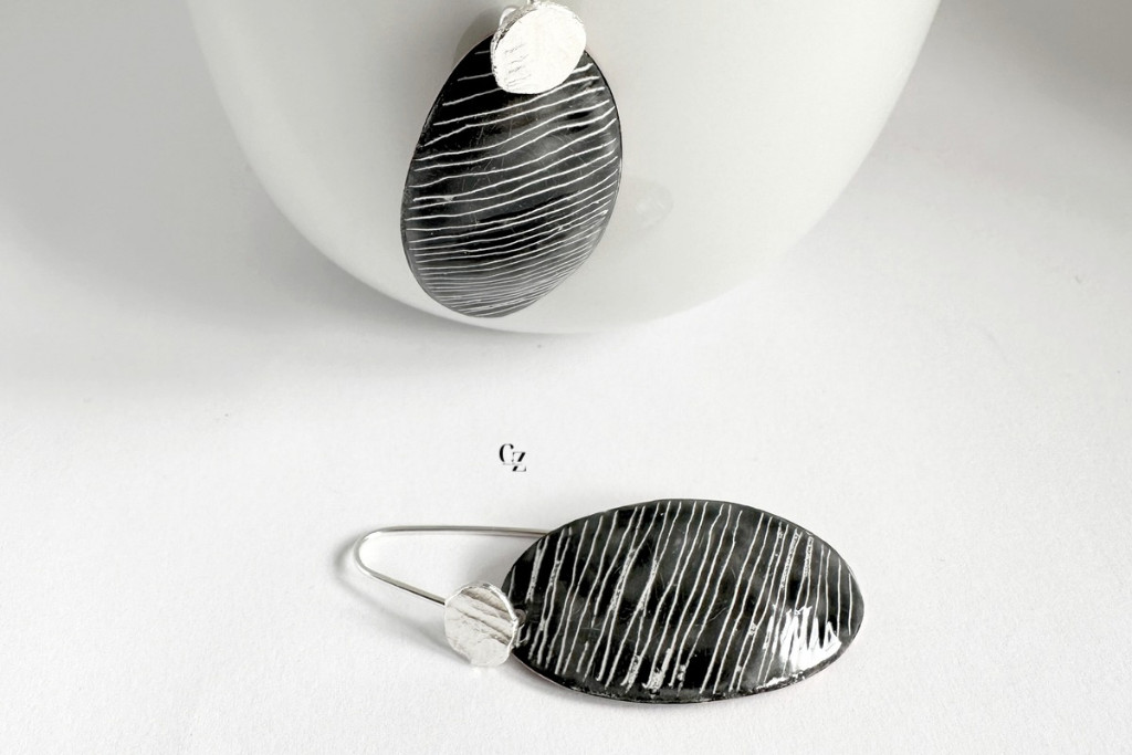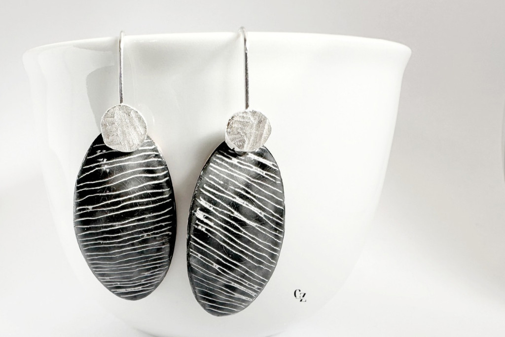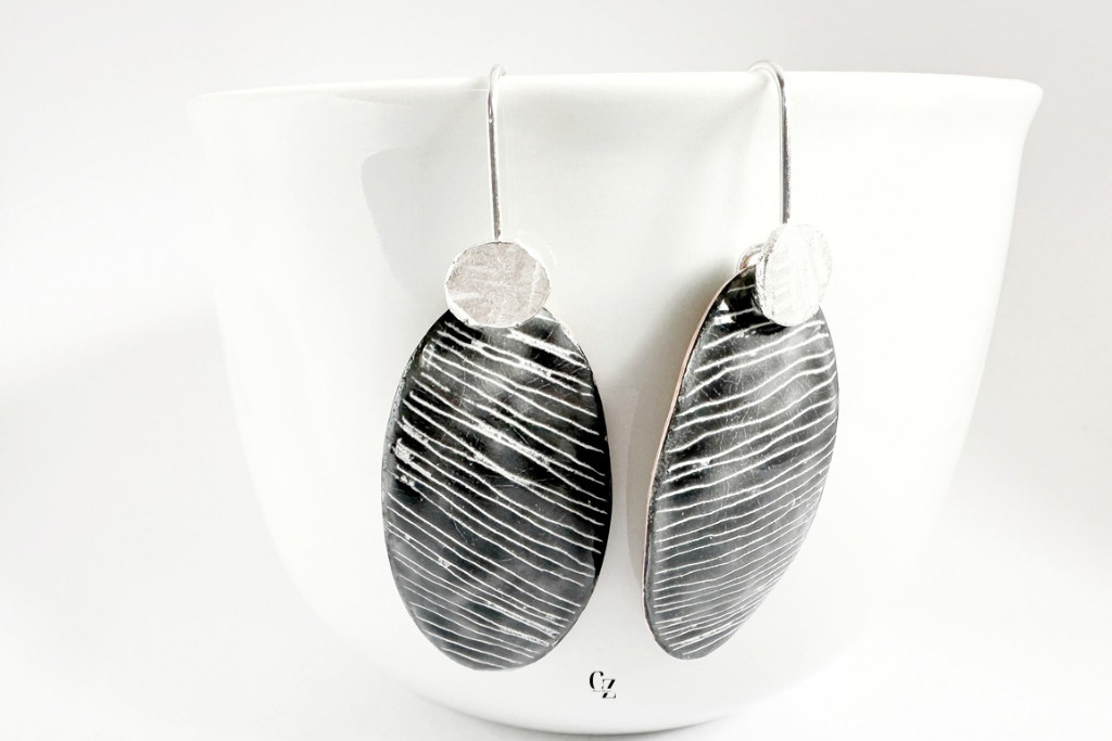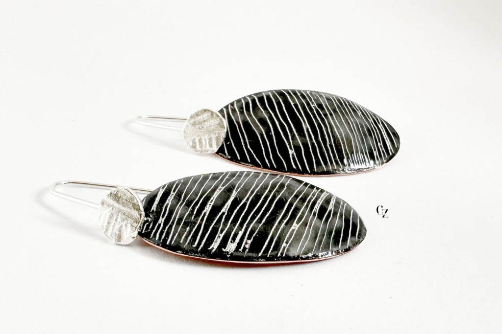 Ezüst akasztóval -tűzzománc fülbevaló fekete fehér
