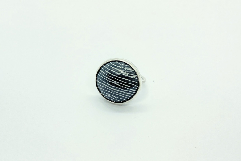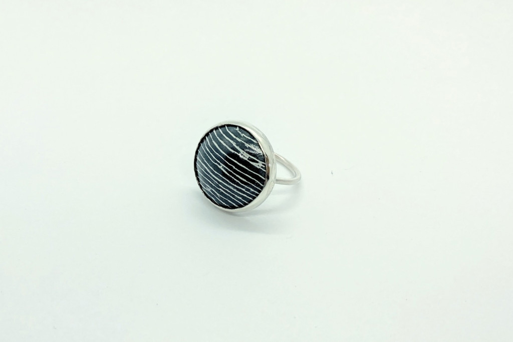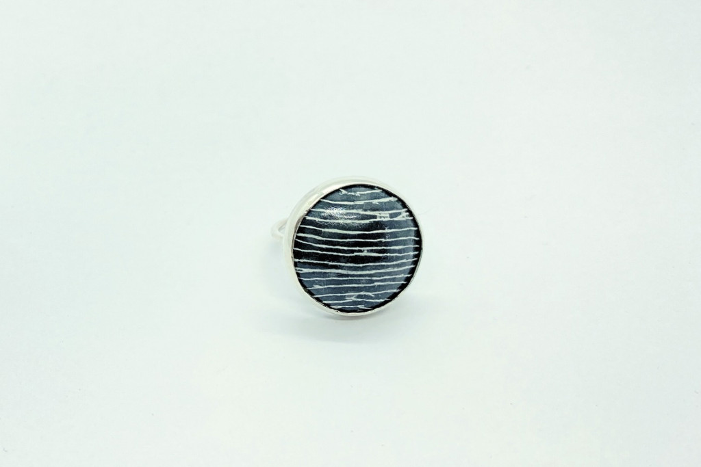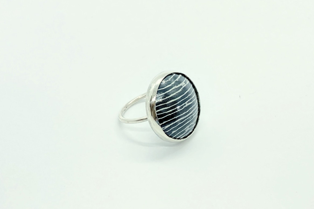 Ezüst és tűzzománc gyűrű, fekete-fehér mintával.