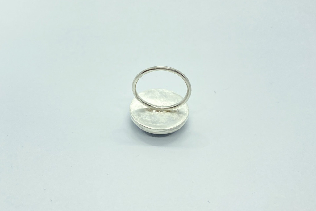 A tűzzománc alapja vörösréz, amelyre több rétegben, magas hőfokon égetve került fel a zománc, így hozva létre a tartós, fényes felületet és az egyedi mintázatot. A foglalat és a gyűrű sínje ezüstből készült, gondosan megmunkálva és polírozva, hogy harmonikusan emelje ki a zománc karakterét.