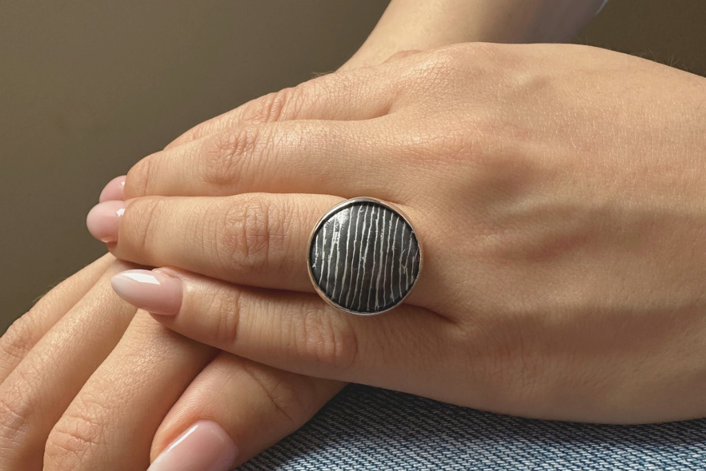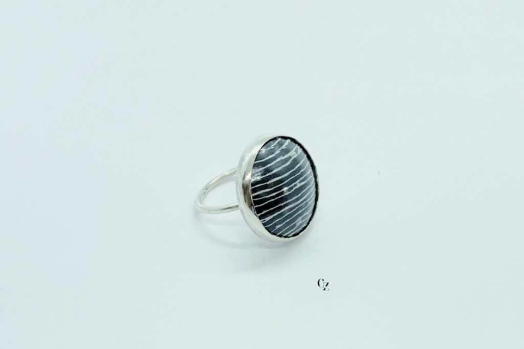 Ez az egyedi, teljes mértékben kézzel készült gyűrű a letisztult forma és a különleges felületi mintázat találkozása. A kerek foglalatban elhelyezett tűzzománc betét finoman ívelt, kontrasztos vonalaival modern, mégis időtálló megjelenést kölcsönöz az ékszernek.