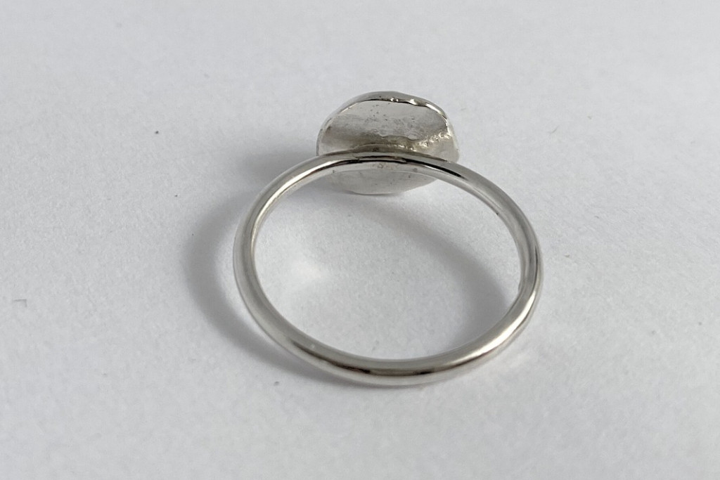A követ klasszikus tokos foglalat tartja biztonságosan, míg alatta egy kézzel kalapált, organikus formájú ezüst alap helyezkedik el. A szabálytalan, texturált felület finom kontrasztot ad a kő sima felületéhez, és különleges karaktert kölcsönöz a gyűrűnek.