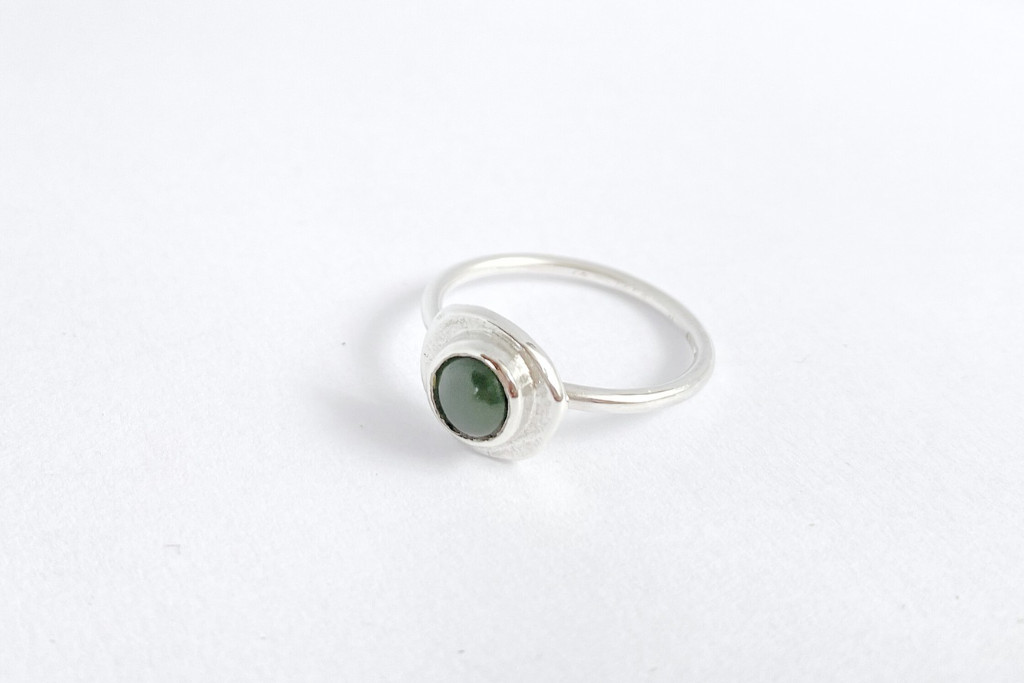 Ez az elegáns, letisztult megjelenésű gyűrű egy zöld színű (Nephrit) jáde kővel készült. A kő finoman matt felülete lágy, természetes hatást kelt és az ezüst foglalat különleges módon emeli ki a jáde nyugodt, mély zöld árnyalatát.