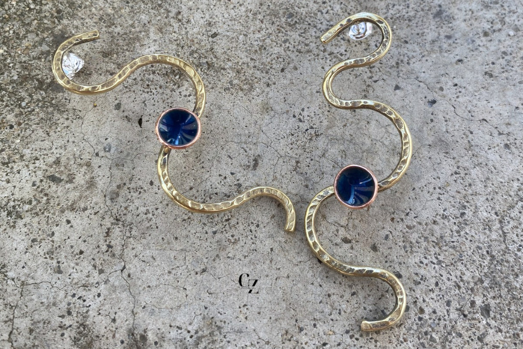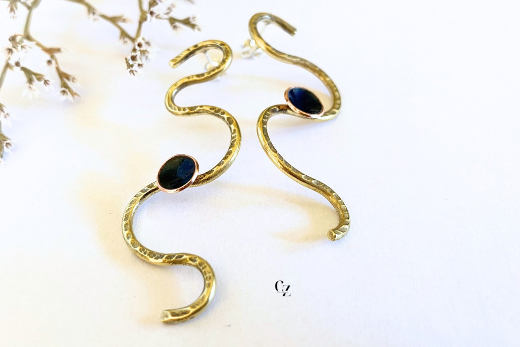 Lágyan hullámzó, organikus formavilágú kézműves fülbevaló, amely a természetes vonalak és a modern minimalizmus találkozásából született. A sárgaréz elemek finoman ívelt, „S” alakú formát rajzolnak, felületük kézzel kalapált, így minden darab egyedi textúrát kap.