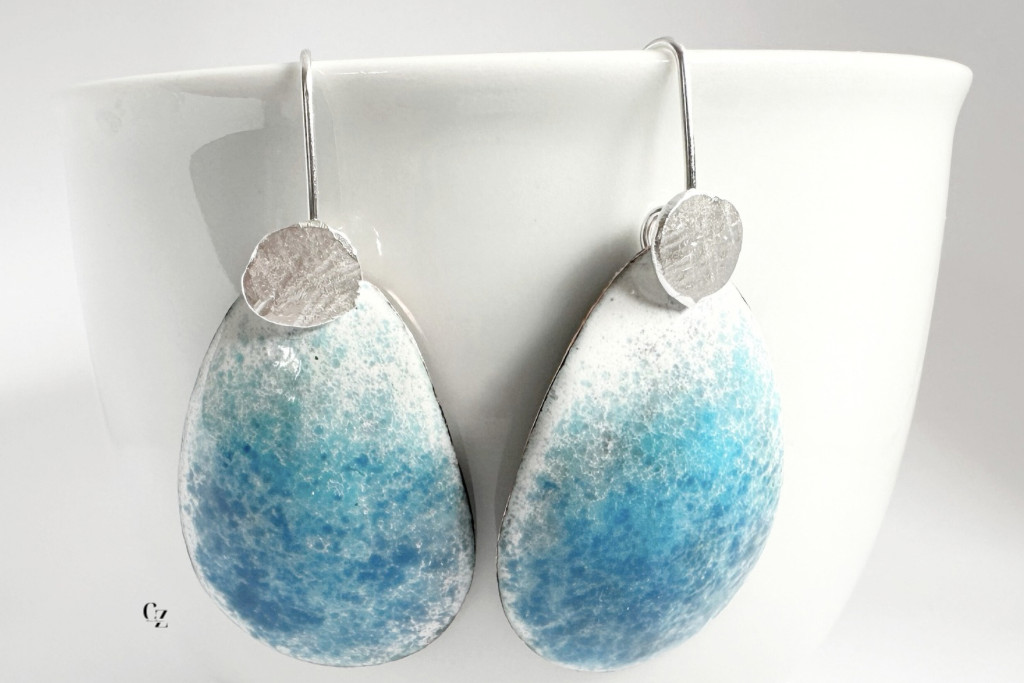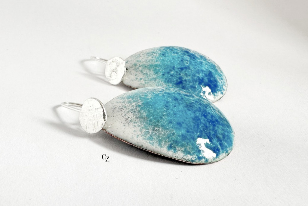 Ezüst akasztóval -tűzzománc fülbevaló kék fehér